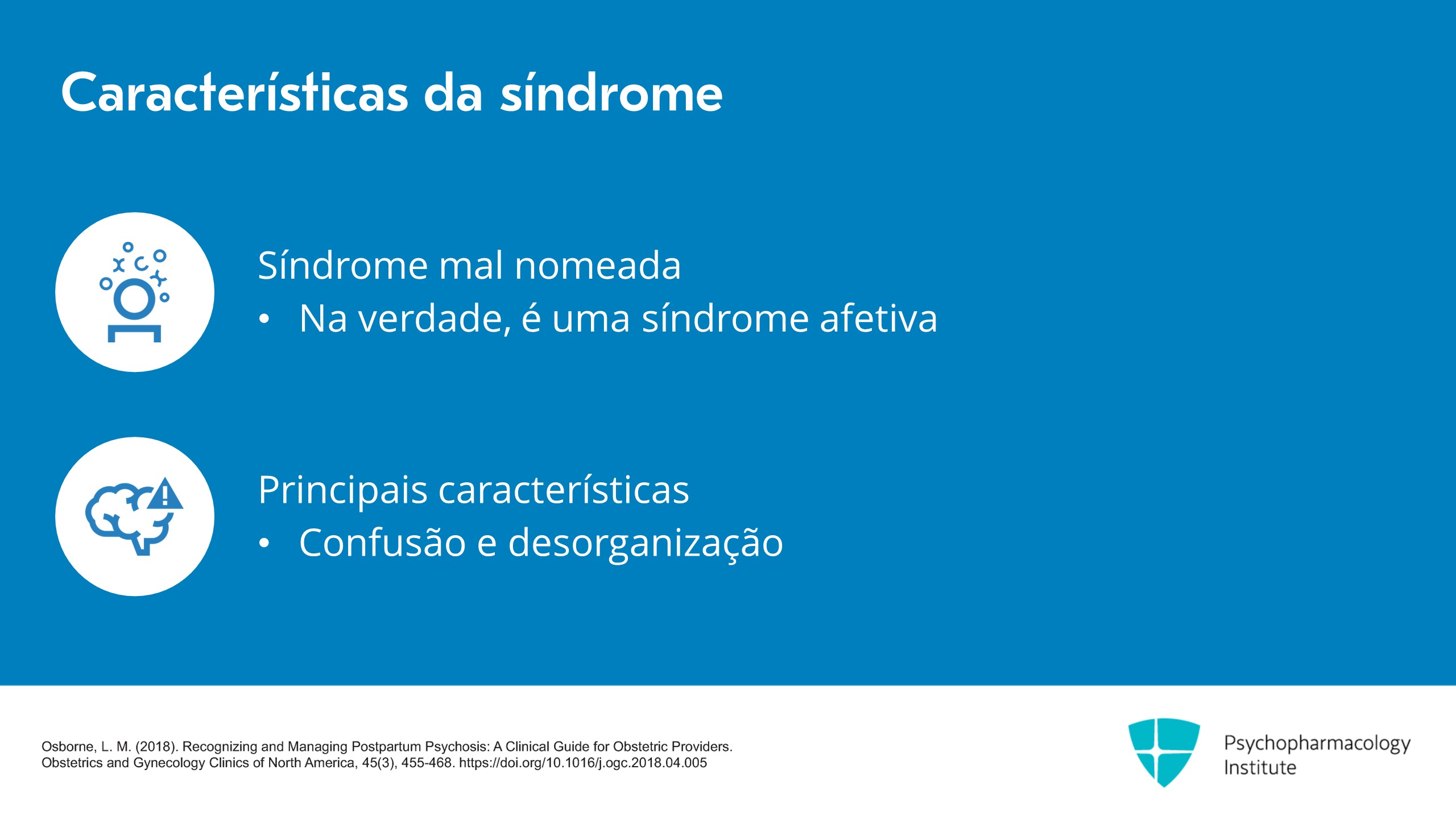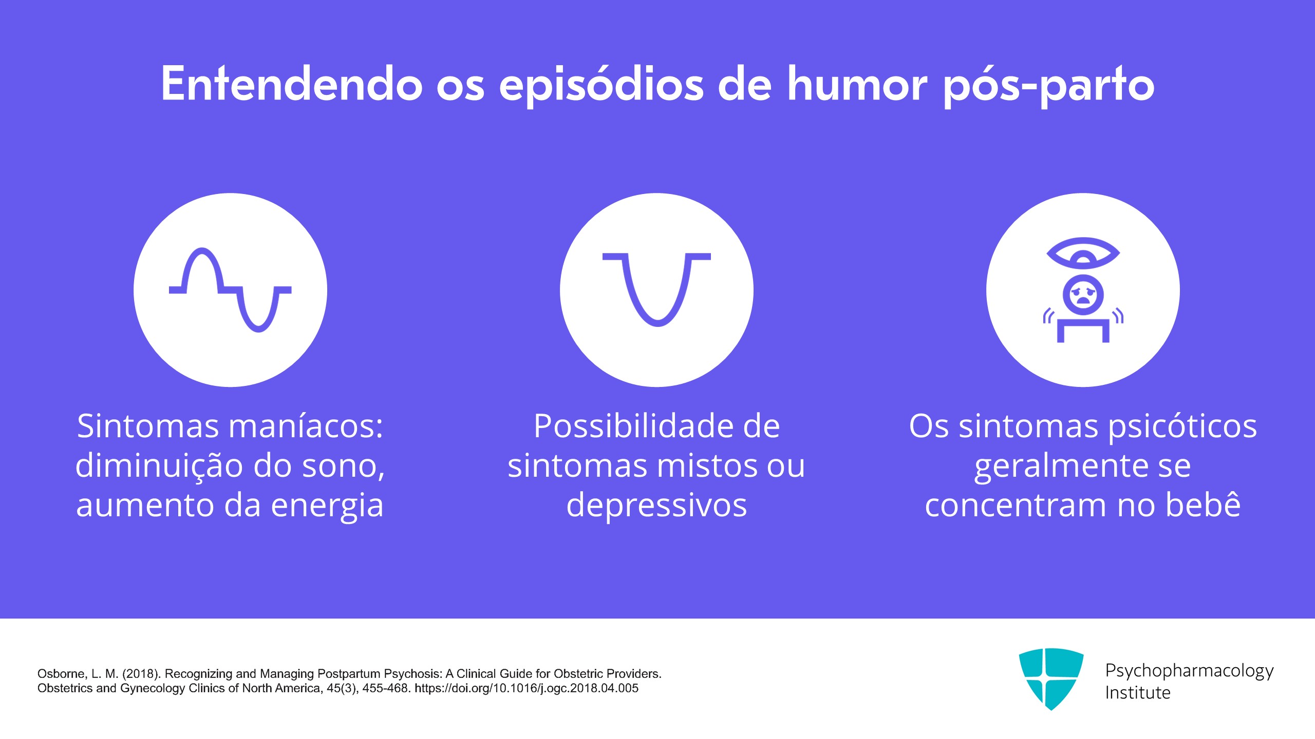 Também é caracterizada frequentemente pela diminuição do sono, aumento da atividade e da energia. Portanto, essas provavelmente lhe parecem ser as características dos sintomas maníacos. E os sintomas maníacos são comuns, mas você também pode apresentar sintomas mistos ou depressivos. Mais uma vez, lembre-se de que os sintomas de humor estão sempre presentes. Essa é uma doença afetiva. Os sintomas psicóticos, especialmente os delírios, podem girar em torno do bebê. Na verdade, eles geralmente giram em torno do bebê.